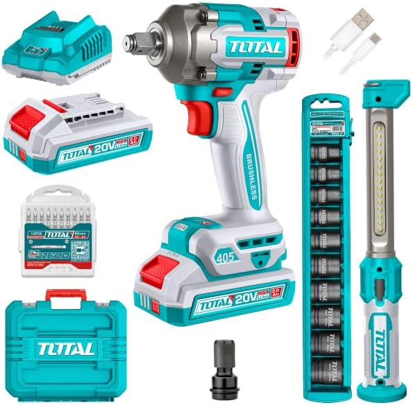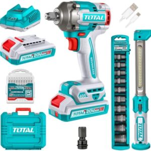 total Combo kit (drill 20 volts, 400 Newton, half inch – blades – bit set – extension – 2 batteries – charger) TOSLI23048