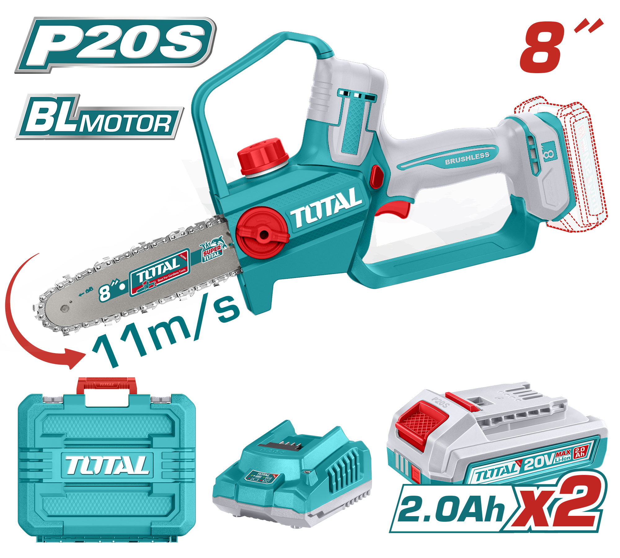 TOTAL Cordless Pruner Saw 20V Brushless – 20cm | 8″ Bar with 2 Batteries (