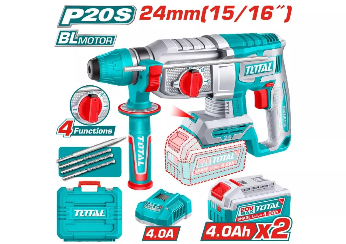 Brushless motor Voltage:20V No-load speed:0-1100rpm Impact rate:0-4900bpm Impact energy:2.4J Max.drilling capacity: Concrete: 24mm Steel: 13mm Wood: 30mm SDS plus chuck system Integrated LED work light Include: 3 Pcs drills(6,8,10mm) 1 Pcs chisel 2 Pcs 4.0Ah battery pack(TFBLI20021) 1 Pcs charger(TFCLI20411) Charge volts:220-240V~50/60Hz Packed by carrying case